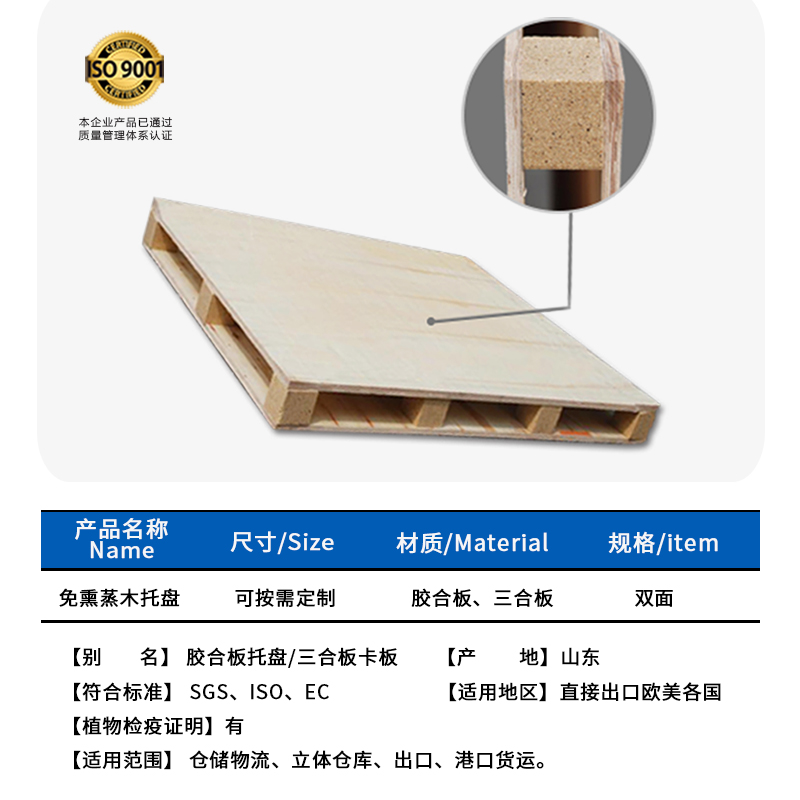 與熏蒸木托盤(實(shí)木托盤)相比,免熏蒸木托盤(膠合板托盤)具有以下特點(diǎn):