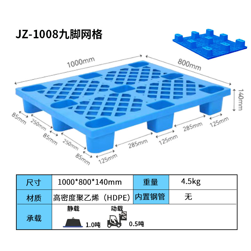 九腳網(wǎng)格塑料托盤的九腳網(wǎng)格托盤其底部是有‘九個(gè)腿’組成的,表面為‘網(wǎng)格’狀,顧行業(yè)為方便稱其為九腳網(wǎng)格托盤,九腳網(wǎng)格托盤大多型號(hào)的都為輕型的塑料托盤,不易用于上貨架或者較重貨物的周轉(zhuǎn)使用,大多情況下九腳網(wǎng)格塑料托盤都是用來倉(cāng)庫(kù)貨物墊倉(cāng)板防潮使用,對(duì)于輕型貨物的周轉(zhuǎn)也可。