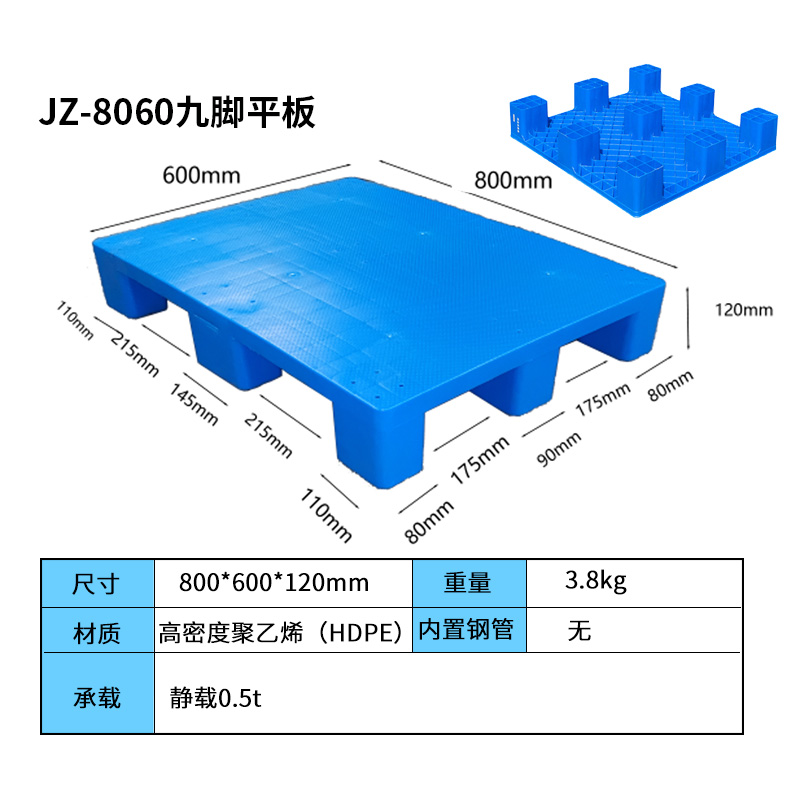 九腳平板塑料托盤底部為“九腳形”設(shè)計(jì)的塑料搬運(yùn)制品,其表面為平面,廣泛應(yīng)用于紡織廠、食品廠、醫(yī)藥廠等企業(yè)。這種托盤的設(shè)計(jì)特點(diǎn)包括輕質(zhì)、平穩(wěn)、美觀,無釘無刺,無毒無味,耐酸堿,不腐爛,不易被細(xì)菌繁殖,易清洗消毒,不助燃,無靜電,無火花,防暴,防滑溜,回收價(jià)值高。與鋼托盤、木托盤相比,九腳平板塑料托盤具有更好的環(huán)保性和安全性,能夠提升企業(yè)形象,提高物流效率。此外,九腳平板塑料托盤因其表面為平板狀,不易積累灰塵,方便清洗;受力均勻,對貨物有很好的保護(hù)作用;平面上均留有排氣小孔,具有良好的透氣性和防潮效果。這種托盤主要應(yīng)用于倉庫輕型貨物墊倉板、叉車周轉(zhuǎn)較輕貨物使用,不適合于上貨架或者轉(zhuǎn)載大重量的貨物?